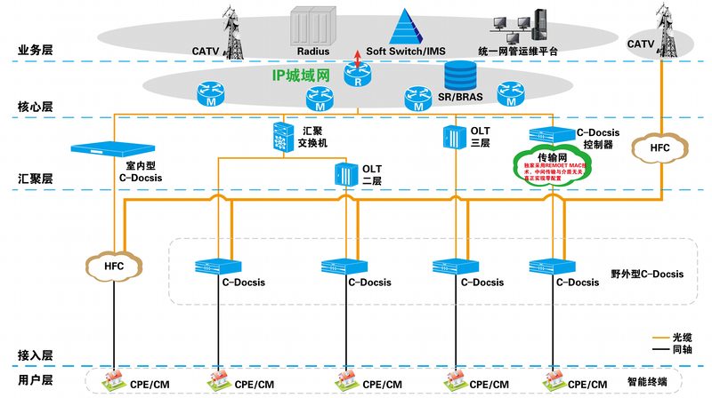 統一網管、高效運維,保障網絡平穩暢通。設備支持xPON,HFC與C-DOCSIS 系統端到端統一網管,有效降低管理難度。